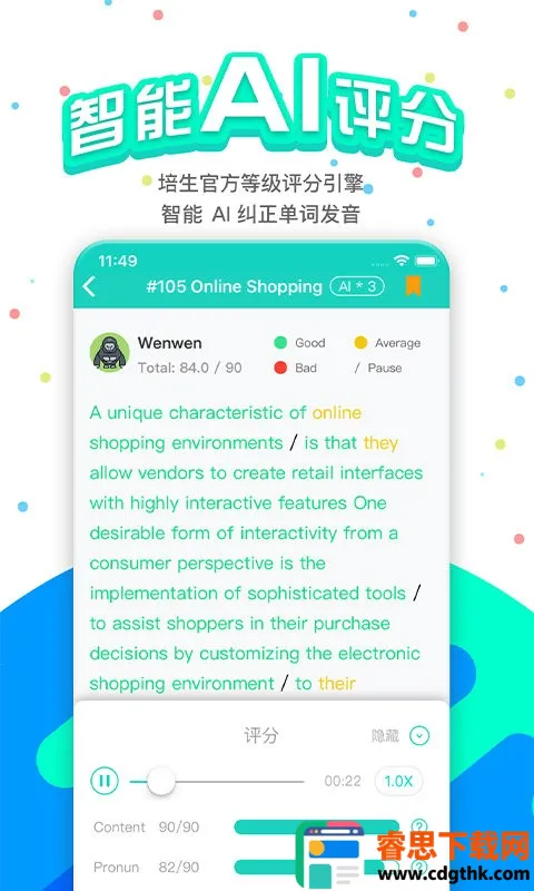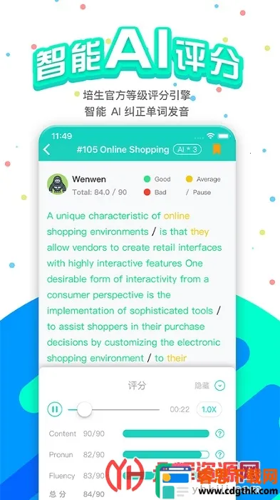 2. 采用智能AI评分,用官方等级评分系统,准确度高,还能纠正发音和流利度。