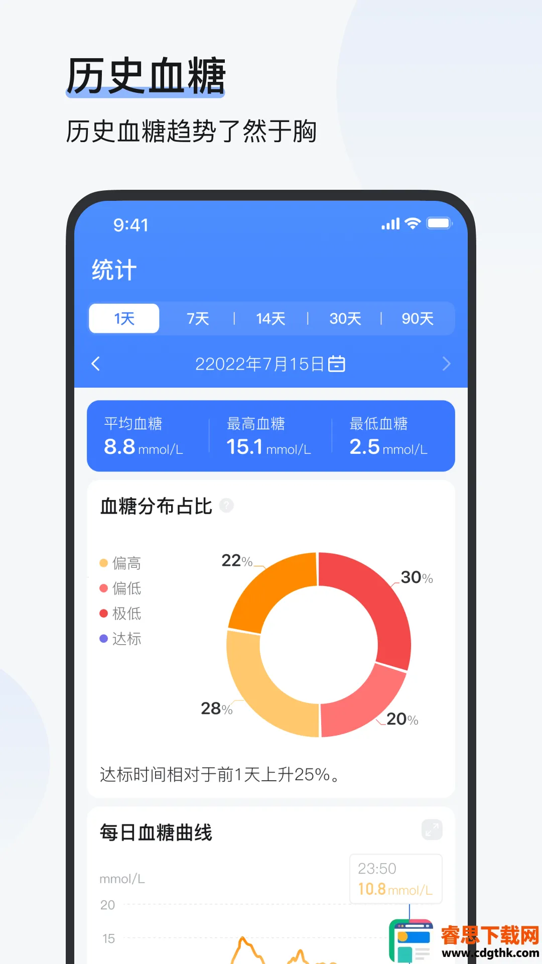 血糖报告详尽:可在此查看自己的血糖报告,从中了解更多健康内容,助力用户更好地掌握自身健康状况。