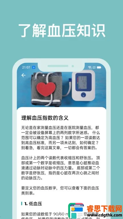 知识丰富:内置权威血压健康知识库,涵盖高血压、低血压的症状、成因、治疗、测量技巧、急救方式等,内容由医学人士整理,专业准确。