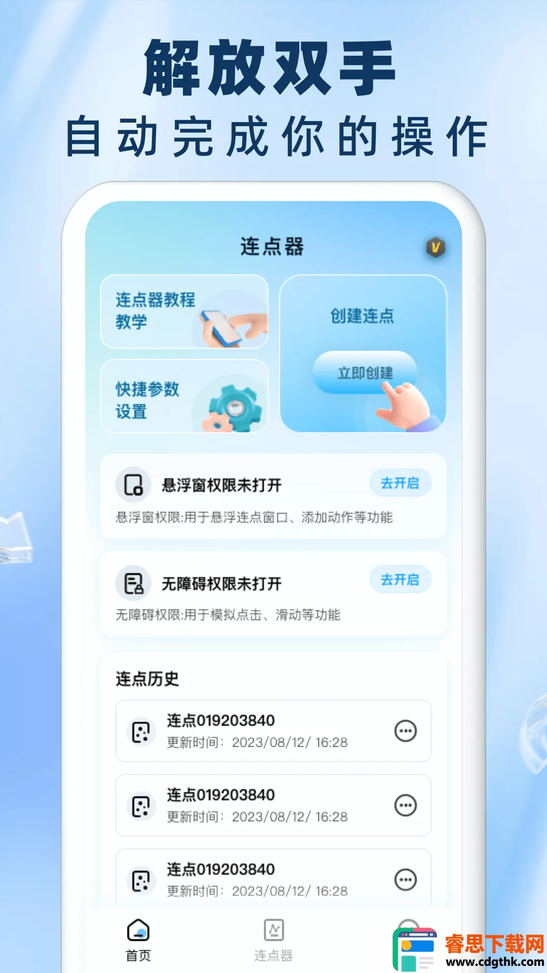 这款自动连点器表现出色。界面简约干净,无需付费即可使用。功能智能化,能一键启动常用循环,满足丰富场景。可自定义连点间隔与执行顺序,用法多样。优势明显,适配多种手机型号,无卡顿闪退;有完整教学视频,新手易用;能创建连点并查看历史记录。亮点突出,内存包小不影响手机运行;循环次数自由设且自动保存;操作方便,随时暂停无需切换应用。功能多元安全,能解决重复办公问题,非常实用。