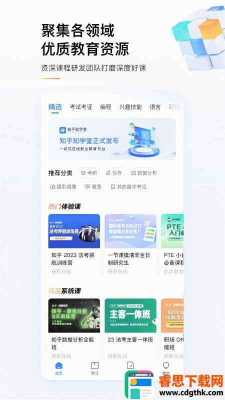 知学堂是知乎旗下专注成年人群的在线学习平台,提供丰富课程,涵盖职场技能、考研等。有直播录播,形式多样,还有线上作业巩固成果,功能贴心,如智能推荐、进度跟踪等,助用户自我成长。