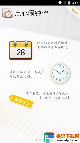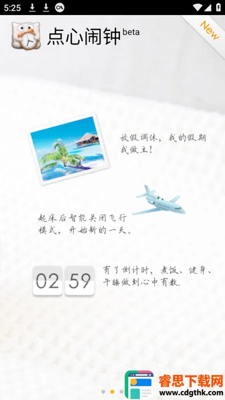 点心闹钟安卓版是一款实用的手机闹钟软件。可自定义起床闹钟,设置响铃时间等。支持多种工作日设置、倒计时、录音备忘、贪睡功能。便捷添加,功能全面,能让你的每一天更规律,适配海量机型,专注闹钟功能。