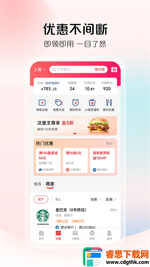 2. 查找方便:支持商户名搜索,能帮用户快速找到感兴趣商户的优惠活动,还有商户分类,可按喜好查找优惠。