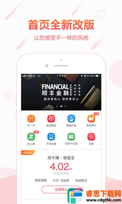 顺丰金融是顺丰企业旗下的综合金融信息服务平台,涵盖支付、理财等功能。提供丰富理财产品及投资者教育内容,操作便捷,能满足多层次财富管理需求,让理财更轻松,致力于提供安全可靠的定制化服务。