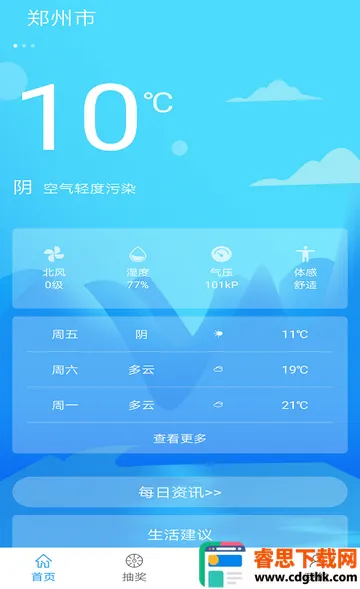 功能丰富:不仅有首页查看天气、每日签到养成习惯、智能分析天气数据等基础功能,还有短时预报,未来两小时分钟级预报,提供更智慧的场景化服务;指数服务升级,让穿衣、钓鱼、护肤等都能根据天气更合理安排;全新动画视觉效果天气背景,看天气也是看风景。