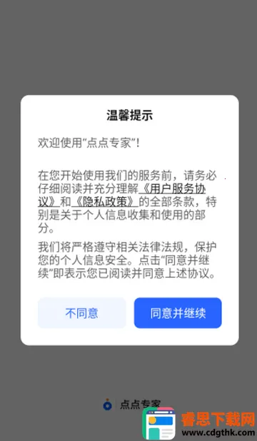1、下载安装后打开应用,首次进入会弹出提示页面,阅读相关说明后点击同意并继续。