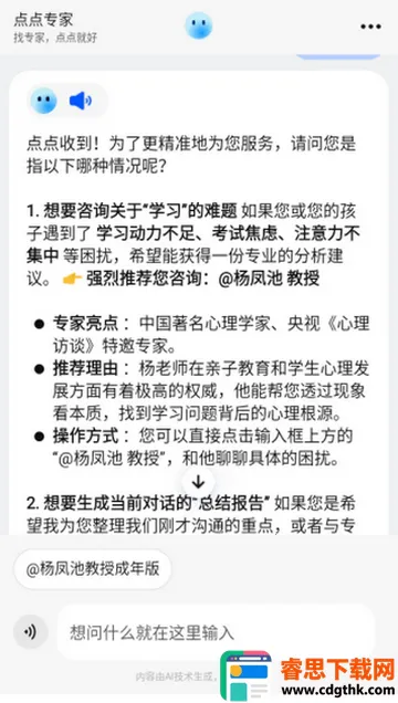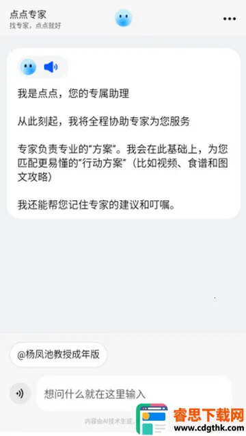 点点专家是一款出色的智能工具。它秉持因您而变理念,为用户工作生活全方位助力。操作超便捷,一点就能快速解决问题。它是7x24小时智能问答与生活助手,文字语音双交互即时响应。覆盖多种场景,解决疑问难题。优势显著,响应速度超快,信息筛选高效,适用场景广,交互门槛低,基础功能免费。无论是日常问题解答,还是经验查询等,都能轻松获取精准答案与实用建议,是身边可靠贴心帮手。