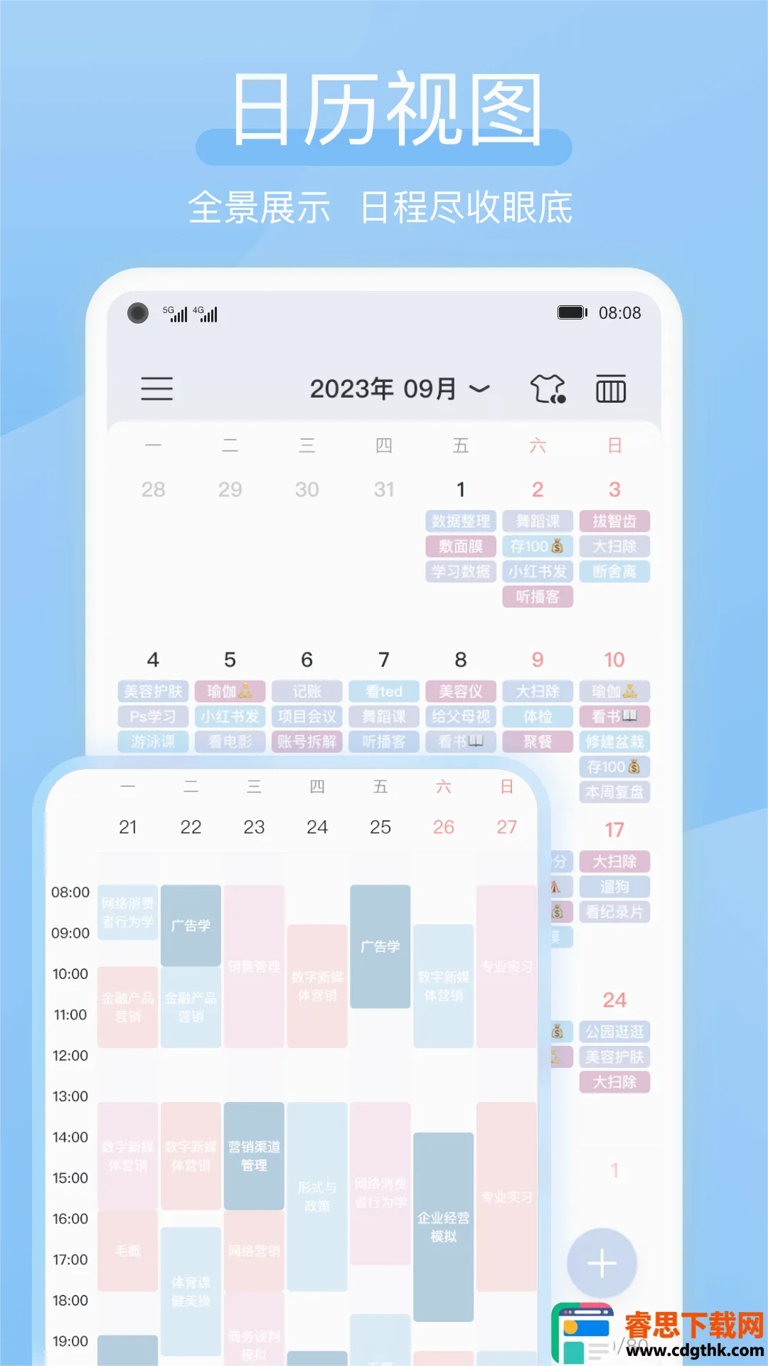 1. 多视图展示:提供日视图、周视图、月视图等,能全景展示日程,从起床到入睡的任务画成时间轴,课程表、工作学习计划等也能清晰呈现,还可概览计划、查看放假安排。