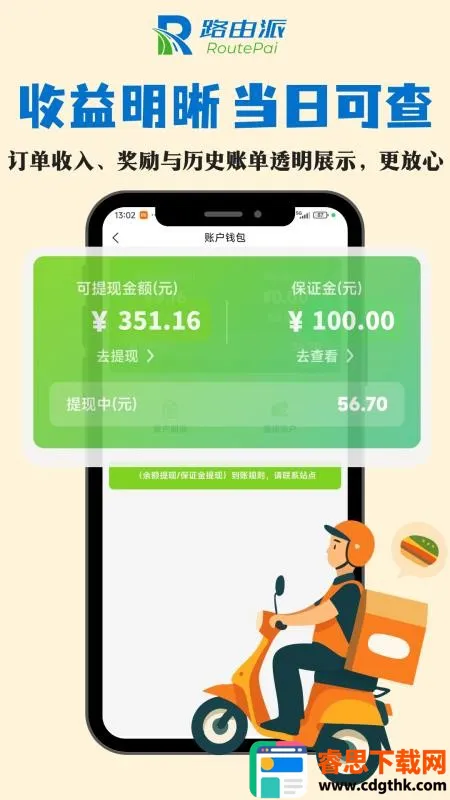 3、收益透明易提现:支持查看收益明细,账目清晰透明,骑手可快速提现到账,方便了解自己的收入情况,轻松管理收益。