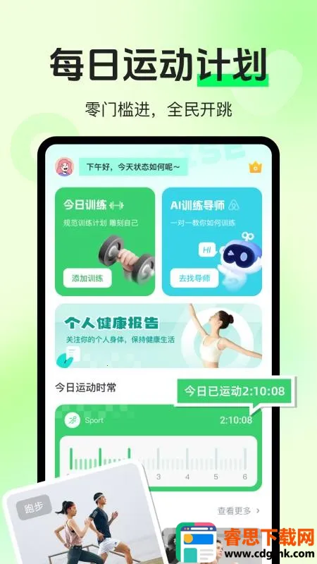 2. 数据闭环:计步、跳绳、训练时长、卡路里一键同步,自动生成个人健康报告,运动趋势清晰可见。