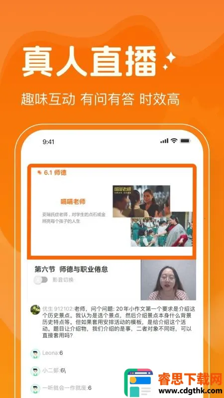 2. 真人直播:直播课程由真人授课,学员在学习过程中可随时在线提问,增强互动性,提升参与感,从而提高课程学习效率。