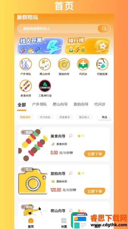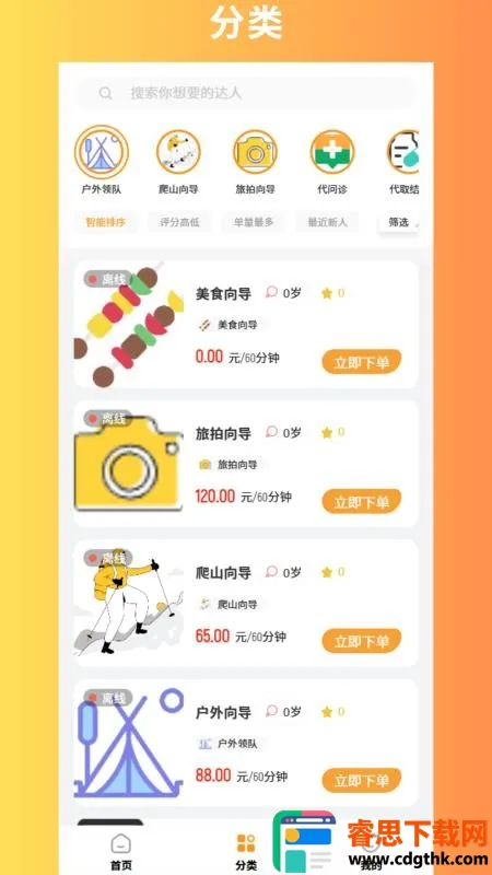2. 详细分类与快速下单:有详细分类,能快速获取不同项目信息,一键下单,达人迅速提供服务。