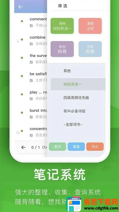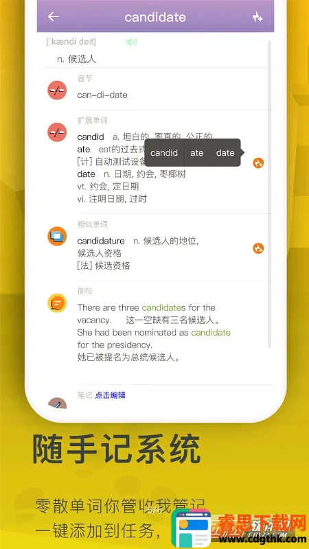3. 贴心功能助力学习:内置笔记系统方便做标注,自定义词库可导入专有词汇,随手记功能能收集零散单词,还有任务核心制让学习计划清晰,进度随意掌控。