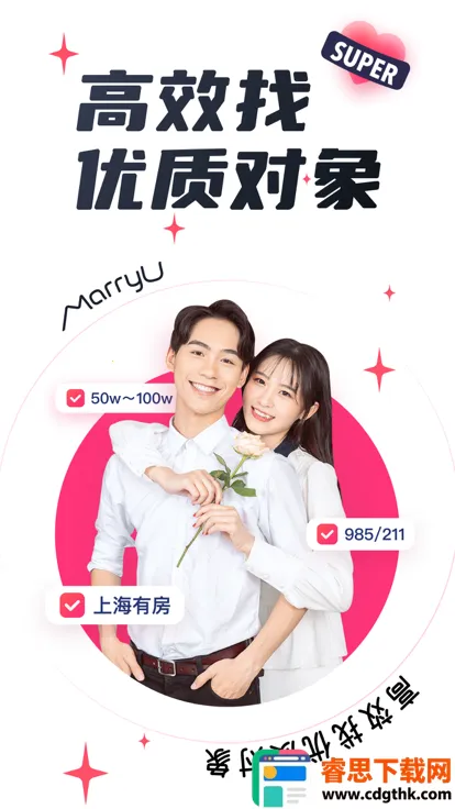 MarryU相亲交友2026官方正版是专注高端婚恋的平台,为一二线优质单身打造。实名制认证,有四项认证、红娘牵线等特色。提供精准推荐、专区群聊等功能,吸引超1200万人,已促成众多爱情故事。