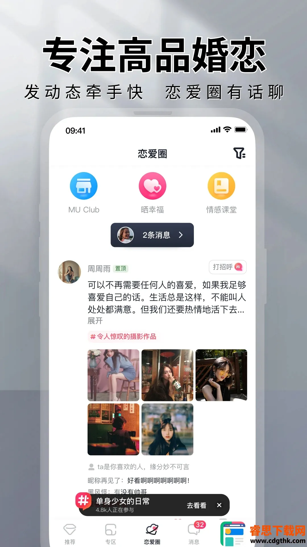 MarryU相亲交友app专注高端婚恋,为一二线城市优质单身打造真实互动平台。注册需提供身份证明和真实照片,通过面相采集保障身份真实。这里有超多优势功能,比如专区群聊,能让有共同话题的人慢慢升温;恋爱圈可分享生活,找到灵魂契合的人;精准推荐每日推送同城单身异性;还有三高圈层,高学历、高颜值、高收入人群众多;资深红娘牵线搭桥,避免尬聊;四项认证确保安全靠谱。它能解决圈子小、接触异性少的问题,轻松拓展社交圈。线上能参与直播相亲、交流互动,还可随时分享生活点滴。关于会费多少,文中暂未提及具体信息。但它确实是个不错的相亲交友平台,能帮你高效找到合适对象,快来体验吧。