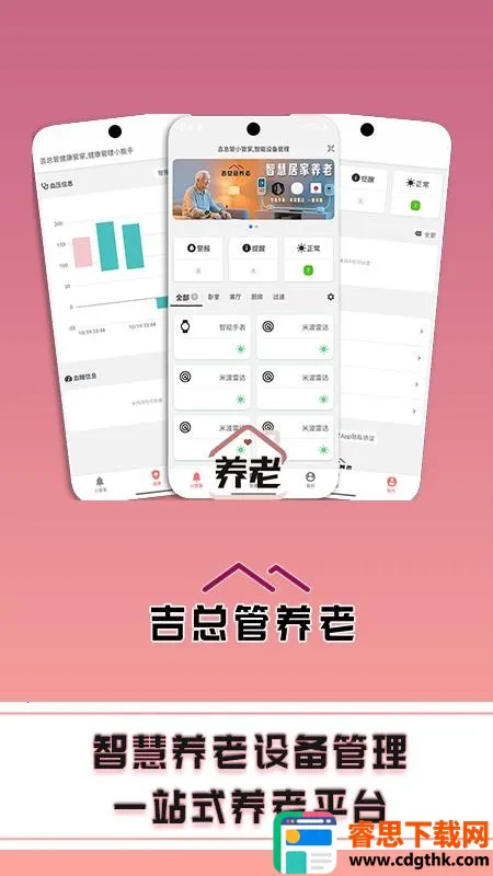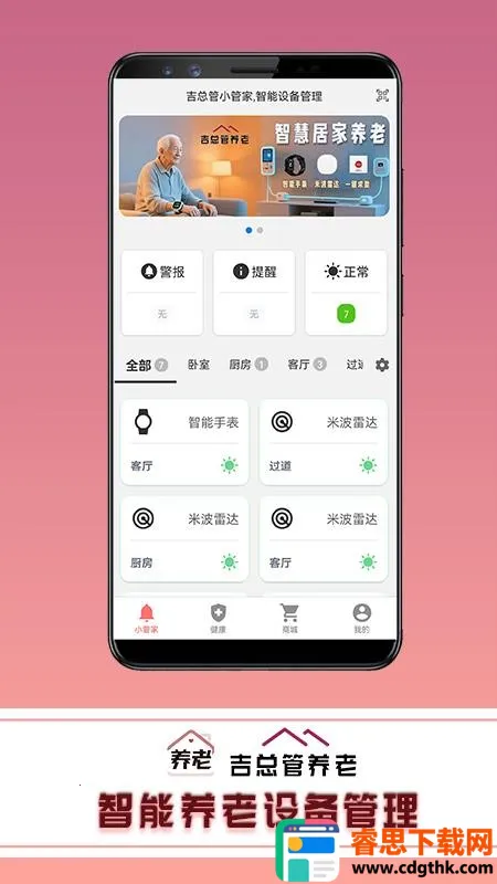 吉总管养老安卓版是提供线上智慧居家养老服务的软件。支持连接管理智慧设备,查看运行状态,一键呼叫,接收警报提醒。还能监测健康信息,具备设备管理、分类查看等功能,提供一站式智慧养老体验。