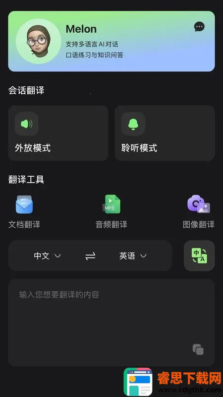 嘿,想知道“melons”英文咋读吗?今天给你介绍一款超棒的软件,它能帮你解决这个问题!这款软件叫Melons,功能超强大。它有多种翻译功能,像文档翻译、音频翻译、图像翻译等,支持多种语言实时翻译,能精准翻译各种语言内容,不管是和外国朋友交流,还是看外文资料,都轻松搞定。还有AI音乐创作功能,能帮你高效创作音乐作品。输入歌词就能通过AI润色,完成作曲,还能随时在线翻唱歌曲,自由选择音乐风格,快速打造高质量原创歌曲。它的会话翻译支持外放和聆听模式,让沟通更便捷。有了它,语言交流和音乐创作都不再是难题,快来下载体验吧!