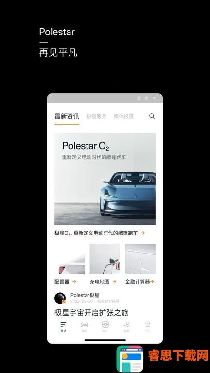 Polestar极星汽车app为车主定制,可远程控车、咨询问题,含车辆购置商城。能查订单、360度看车、定制配置,支持预约试驾、信用购车,还有充电及维修定位等服务,购车便捷有保障。