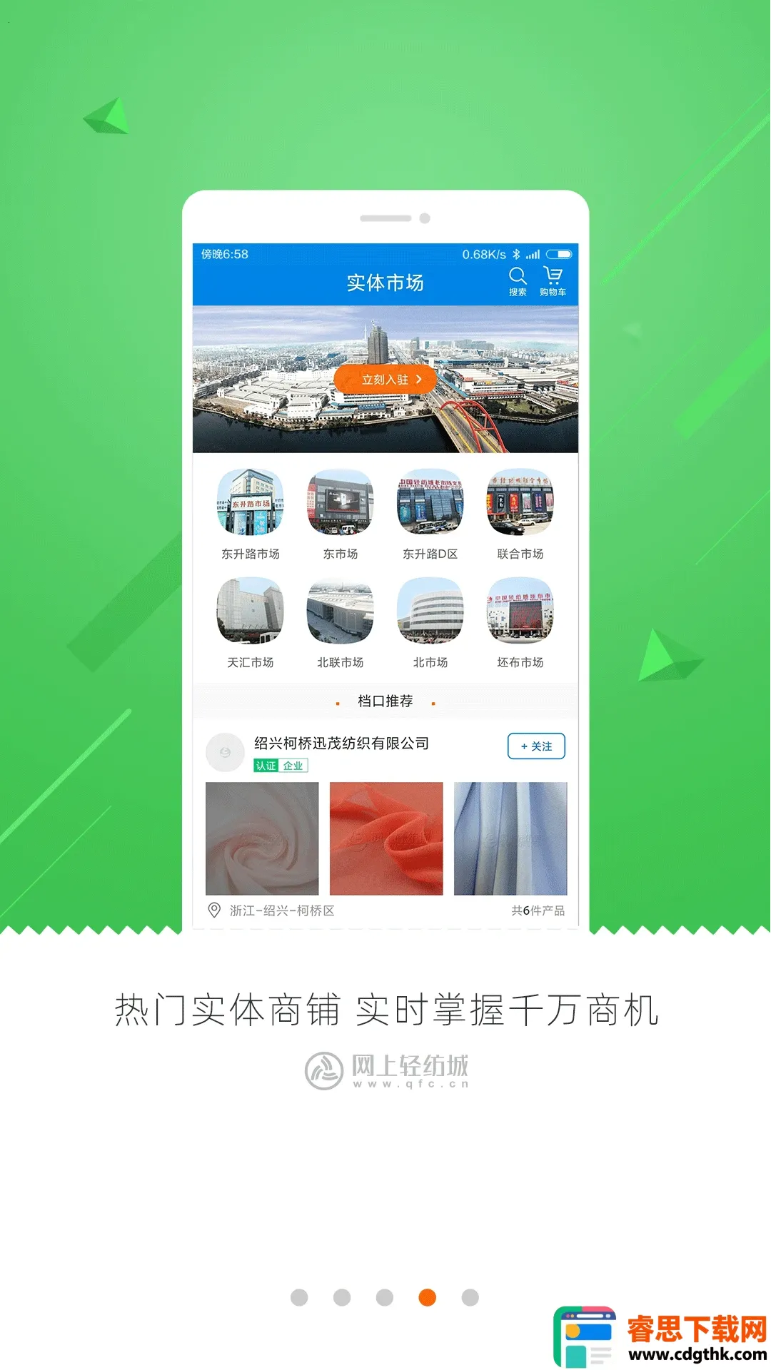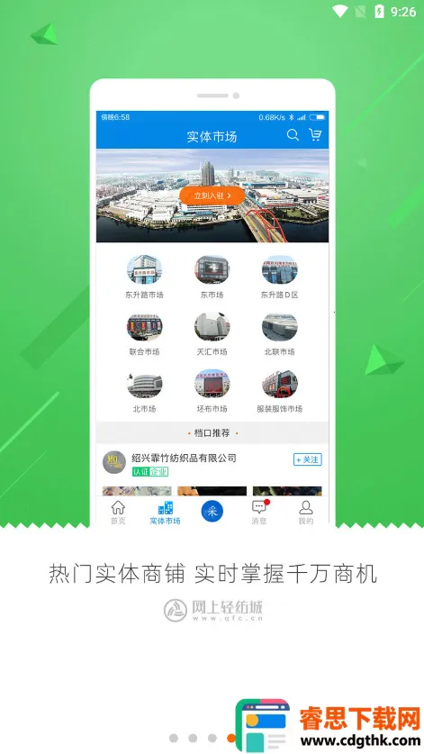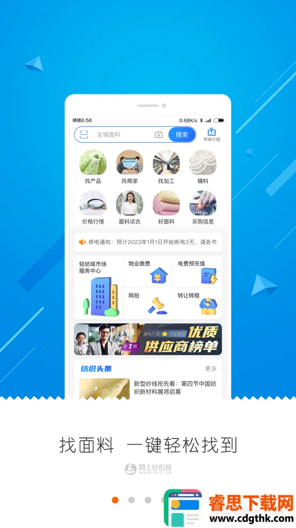 网上轻纺城是一款专为纺织行业打造的多功能电子商务平台。它能解决纺织从业者诸多问题,带来极大便利。对供应商而言,可轻松开设在线店铺,快速发布新产品,高效管理客户订单,设置主营产品后同类采购信息主动提醒,随时随地与全球采购商做生意。采购商能便捷搜索感兴趣的纺织品,发布采购需求并有效管理订单,手机拍照就能发布采购信息,众多供应商为您服务。平台亮点十足,品类丰富,集聚各类纺织品;资源海量,汇聚全网优质资源;纺织商品达出口标准;支持线上付款;全国商家众多,供求信息丰富。在这里,还能收藏商铺、添加好友,发展生意伙伴,保持客户联络,同时每天推送纺织头条,让您及时掌握业界动态,轻松抓住生意机会。