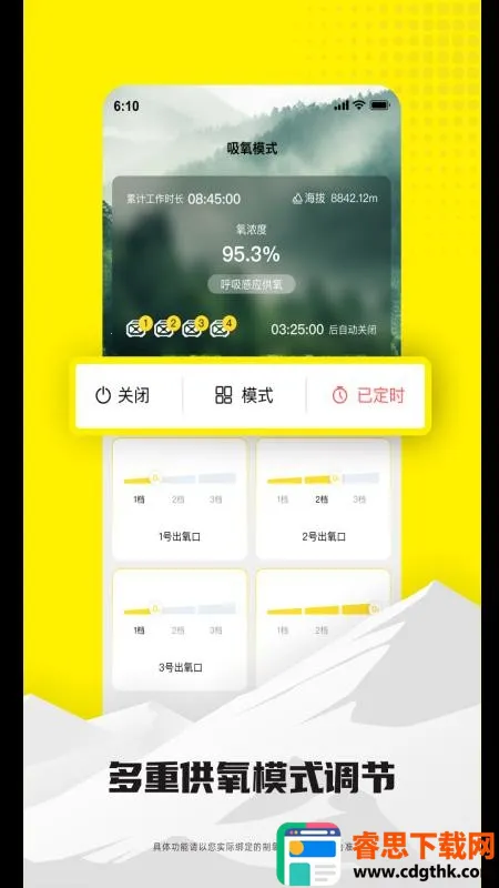 其特色也很突出,连接模式简单便捷还能无线连接,操作流程不复杂,人人能轻松上手。通过软件能详细了解氧气浓度和海拔数据,还有多种调节模式满足吸氧要求,界面清晰简洁,信息一目了然。有了米拉氧气APP,高原出行更便利,再也不用担心高反啦,赶紧下载试试吧!