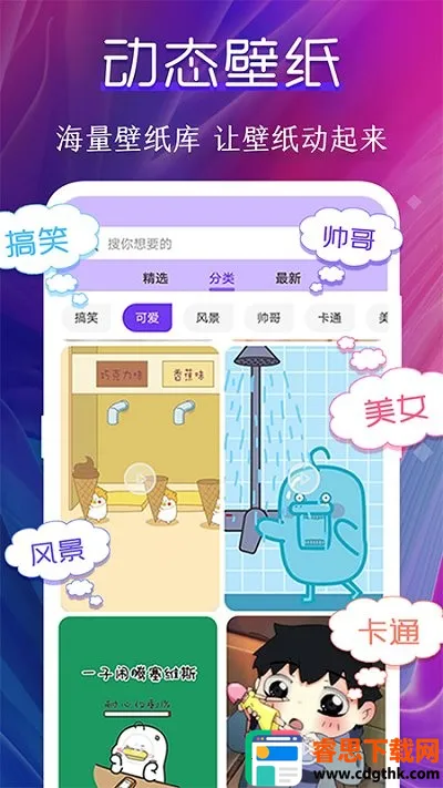 1. 壁纸分类超清晰,可爱、搞笑、卡通、真人偶像等风格应有尽有,查找轻松不费劲。