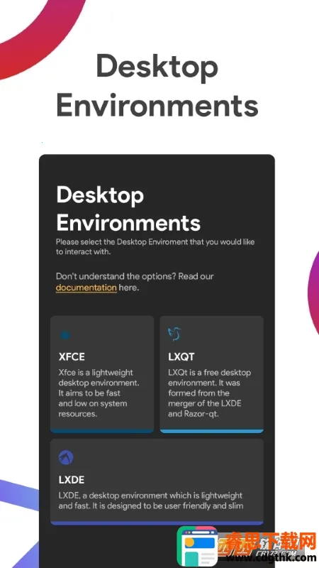 它能解决你想在手机上体验Linux系统的需求。部署多个发行版,还能同时安装多个并随时切换。有图形桌面环境,除命令行,一键安装轻量级图形桌面,带来接近电脑的操作体验。集成高级管理功能,可保存管理和同步常用Linux命令。支持高级定制选项,让高级用户深度自定义桌面。