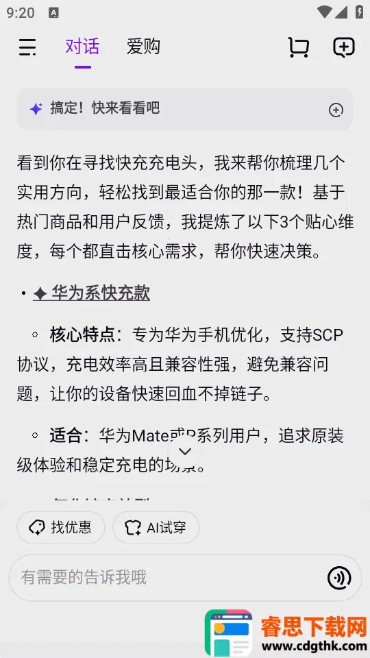 3. 高效决策:原创线上逛街模式,边问边逛边筛选,总结商品参数口碑,省心高效。