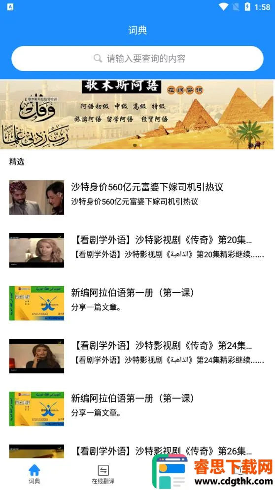 它能快速显示搜索结果,支持列表快速显示查词结果及缺省解释,还有收藏、完善词条等贴心功能。社区交流功能让圈子好友能共同学习提高。丰富的情景对话包含三十多个场景、近千条会话,涵盖多个主题,每天学5分钟,助你畅游阿拉伯世界。在线翻译有强大的有道中英互译和必应多语言在线翻译。