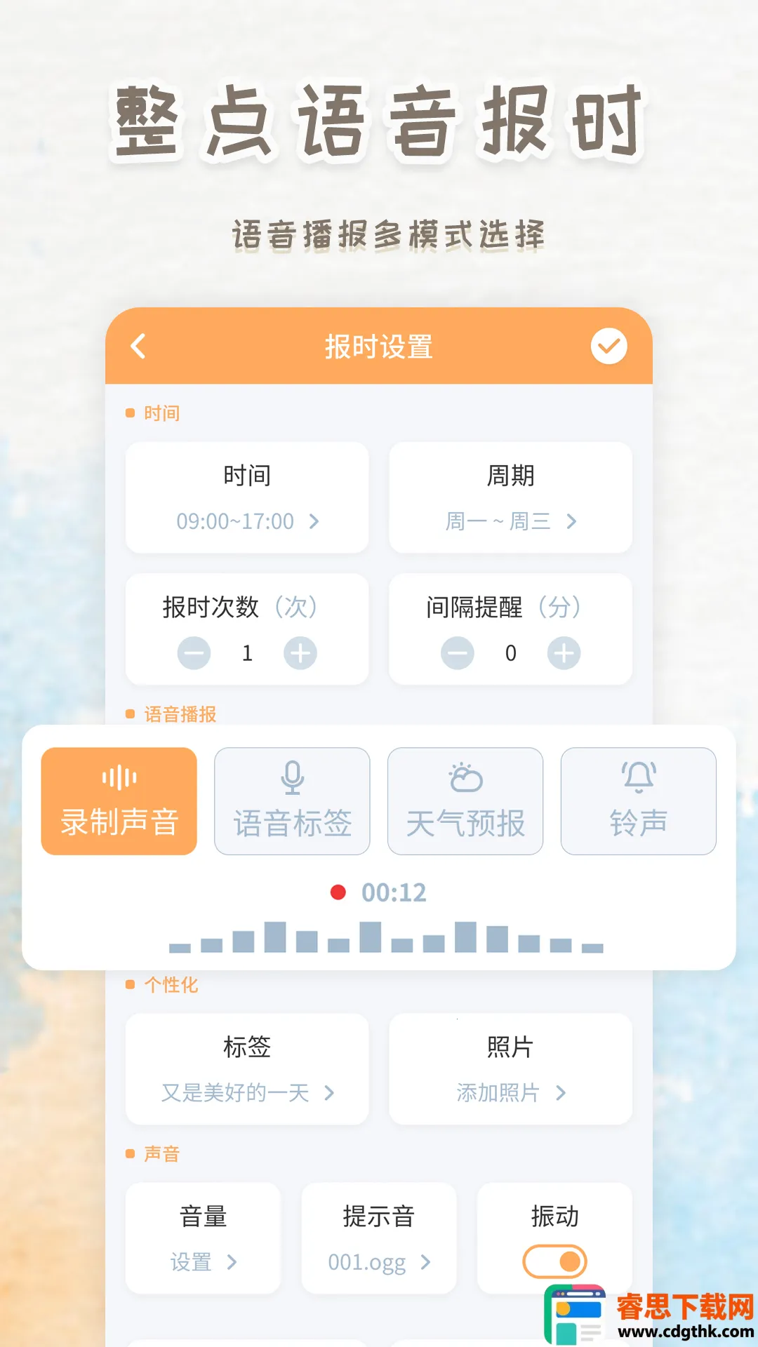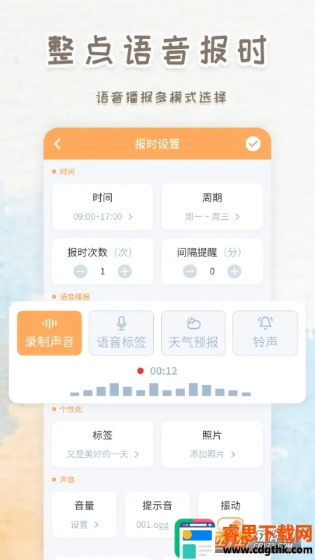 2、语音报时与智能提醒功能:可整点自动播报时间,或通过自定义语音提醒当前时间,助你随时掌握时间动态。