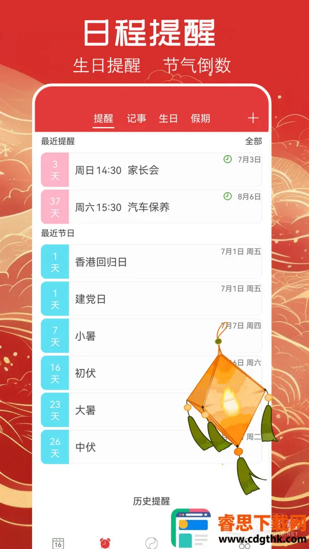 节日节气提醒贴心:自动标注国内外重要节日及二十四节气,提前提醒,还提供节日习俗、节气养生知识,丰富文化生活。
