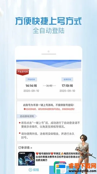 4、安全账号保障:采用专业级账号保护,防外挂技术,全方位保障出租方的账号安全,让您租得放心。