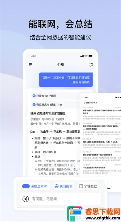个知AI是一款AI互动辅助软件,支持生成个人知识库、上传文件搭建学习网络。搭载DeepSeek大模型,能智能问答对话,支持语音输入、深度思考与联网搜索,可实时整合网络信息给出全面准确答案,适用于生活学习办公。