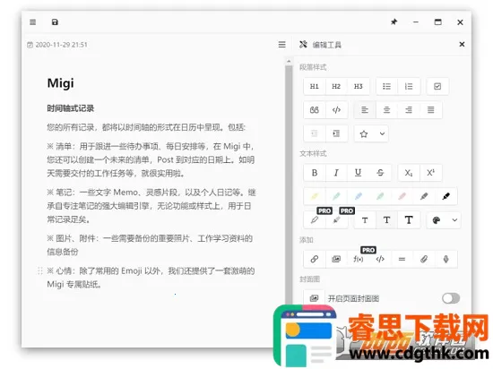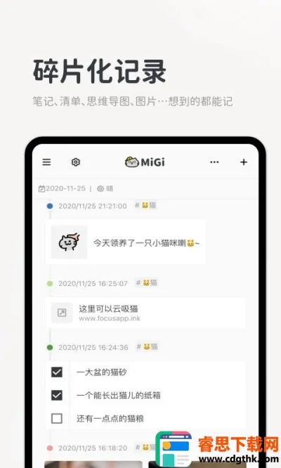 Migi 是培养自律习惯的日常记录软件,能记工作安排、心情等。以日历呈现任务,支持标签分类,可文本或图片记录。亮点有按类型查找、自由设置样式、打卡记进度,操作简单易养成记录习惯。
