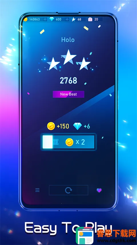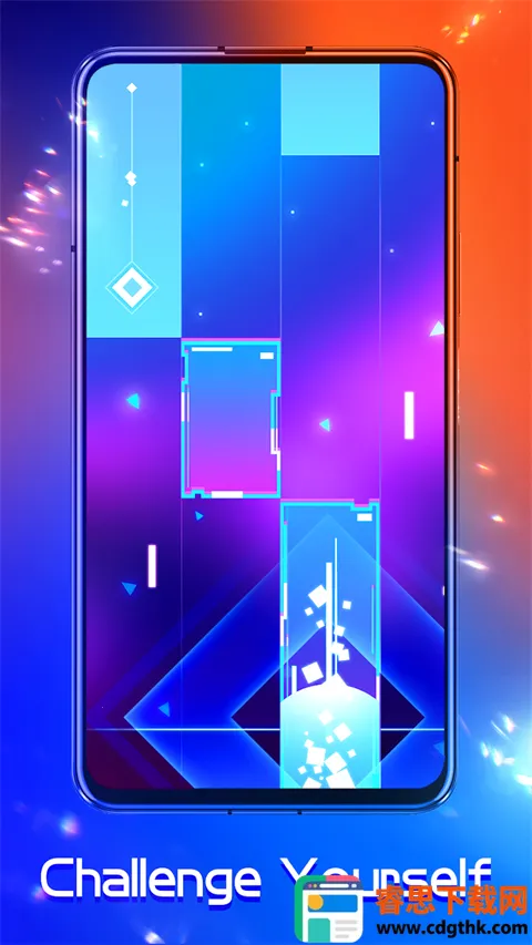2. 完美融合钢琴与EDM音乐,中期节奏加快、难度提高时,背景会变得绚丽多彩,从视觉、听觉、操作三方面带来强烈反馈。