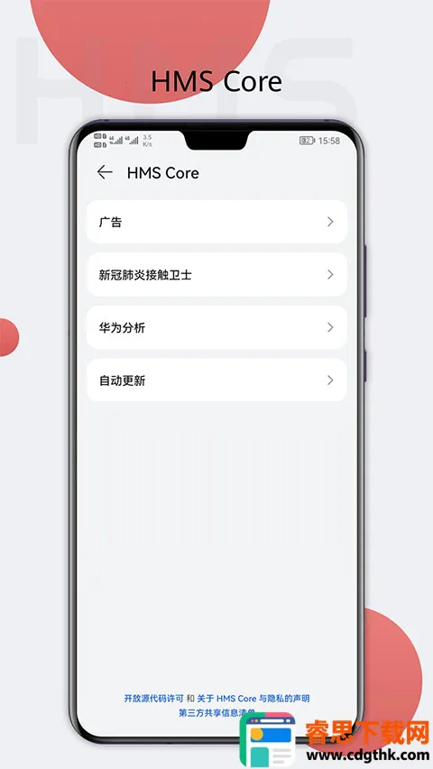 HMSCore最新版是华为移动服务软件,安装后登录华为账号,众多华为系统应用均可使用,含云空间、隐私中心等功能,操作简单快捷,能服务各类华为设备,自动更新且可设置WiFi下更新,还能关闭自动更新。