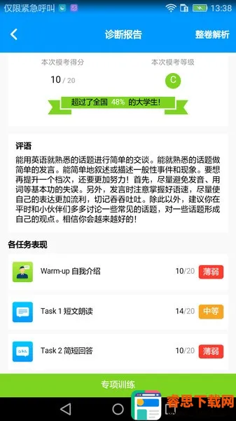 四六级冲刺宝能帮你解决很多备考四六级的问题。它有模拟考试功能,能让你提前熟悉考试流程,进行综合能力诊断。要是一直诊断不出来,别着急。你可以检查网络是否正常,确保软件能顺畅运行。也看看是不是在操作过程中有遗漏的步骤。它还能根据你的个人水平推送专项训练,直击弱点,稳步提升成绩。有海量名师精品课程在线观看,助你轻松备考。还有高分攻略和提分秘籍,考前必读。大量真题和模拟题供你练习,助力冲刺高分。它支持定制口语和笔试备考计划,通过真题模考诊断水平,获得针对性训练内容推送。让你随时随地能学习,遇到问题还能随时提交,得到专业老师解答。有了四六级冲刺宝,备考四六级更高效、更便利。