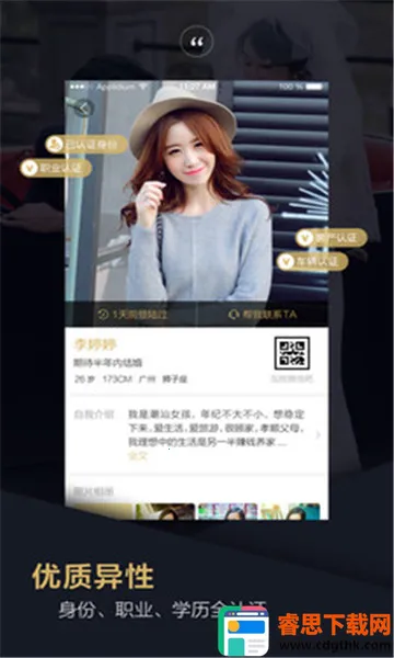 品质相亲婚恋是一款婚恋社交 app,严格身份审查,解决陌生人社交破冰难题。有精确查找、智能匹配等功能,全新实名社交,丰富恋爱社交功能,多种特色助用户轻松脱单,还有专业红娘等优势。