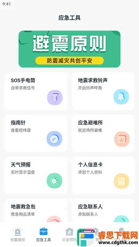 实用工具集成:包含手电筒、指南针、GPS定位、查找避难场所等实用小工具,助您应对地震危机。
