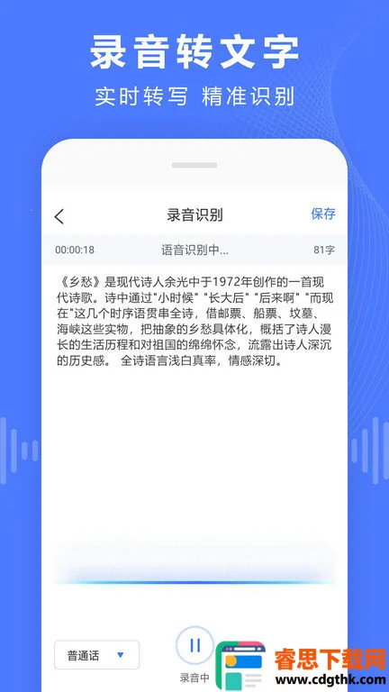 4. 实时翻译:文本识别翻译速度极快,便于查阅翻译,一遍录音一遍同步文字以及翻译文本,识别更精准。