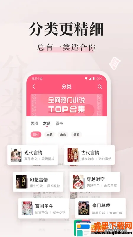 2. 分类精细,不仅有男频女频,还能根据阅读喜好个性化订制,总能找到适合自己的一类小说。细化分类,精准匹配用户喜好。