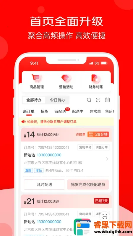 1. 支持全场景管理,能实时接单拣货及追踪配送进度,大幅提升工作效率。
