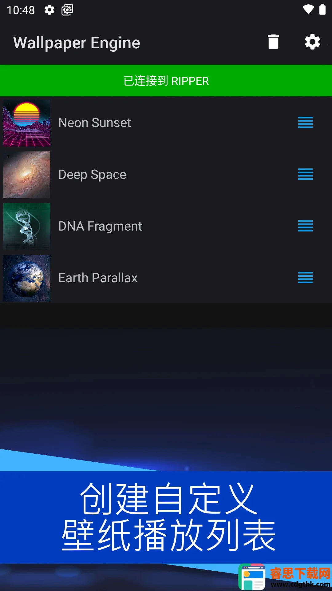 壁纸引擎是一款超棒的多功能桌面工具。它有大量不同类型壁纸,分类详细,免费壁纸可直接用,能轻松查找搜索喜欢的类型,带来优质壁纸体验。其功能强大,集动态和静态壁纸设置于一身,可自定义壁纸外观样式,无广告不追踪用户。支持视频、GIF 及交互式 2D、3D 场景作壁纸,能设置播放列表自动循环播放。还可与 Windows 上的 WallpaperEngine 连接,同步桌面壁纸库至手机。在手机上,开启省电模式壁纸自动暂停。操作简单,多数功能一键完成,能自由切换手机壁纸,导入 PC 壁纸,自定义壁纸参数等。无论你喜欢什么风格,都能在这找到心仪壁纸,轻松定制屏幕外观,让桌面和锁屏都充满个性。