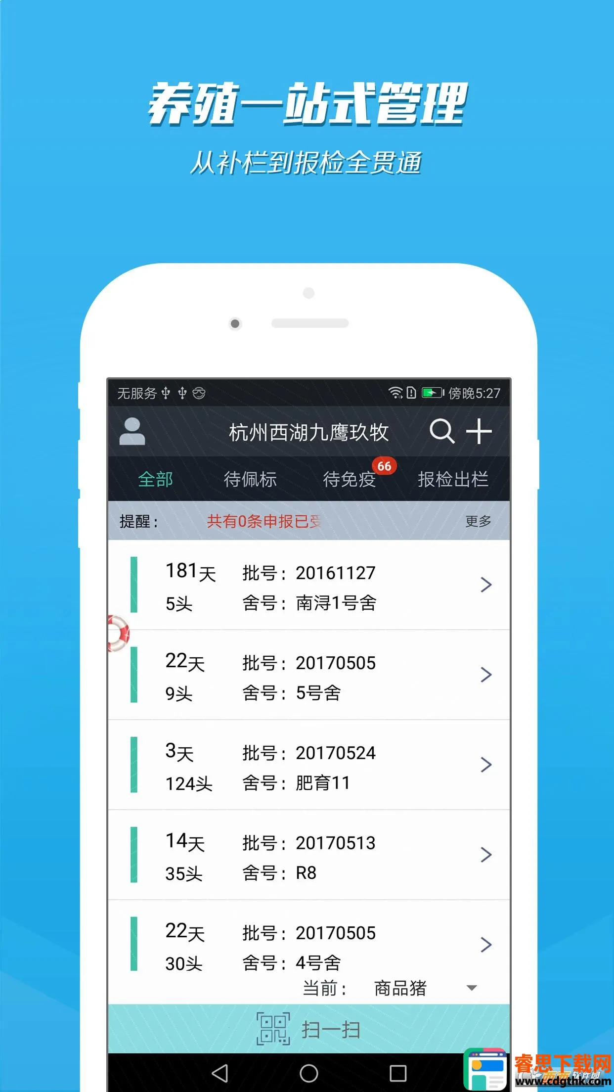 畜牧掌上通是一款超实用的数字畜牧移动服务平台。它功能强大,能帮规模养殖户或散户进行日常存栏、补栏、佩标、免疫和报检出栏等业务操作。扫一扫就能随时随地查询耳标相关信息并扫码佩标,还有提醒功能,可及时查看报检信息是否受理及受理人前往时间。另外,能对存栏信息进行修改、盘存、无害化处理等操作。