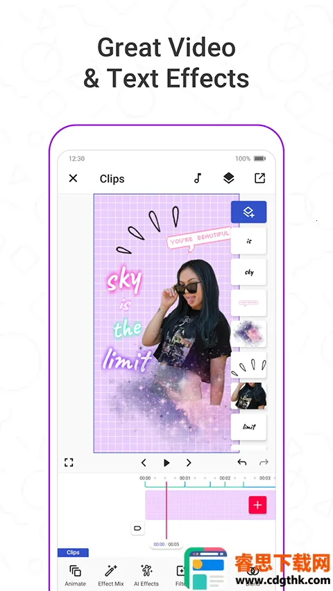 2. 功能丰富多样:拥有100多个高级视频效果、表情符号、贴纸、音频工具和修剪选项等,还能使用手机照片创建自己的效果,涵盖基本编辑功能如合并、添加歌词、剪切、修剪和合并片段等。
