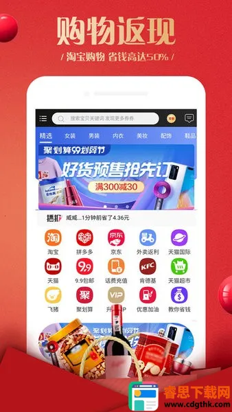 1、海量优惠:每日更新海量优惠券,涵盖美妆、数码、服饰等上万品类,折扣力度超双十一,还有九块九包邮专区和一元购专区,让你购物超省钱。
