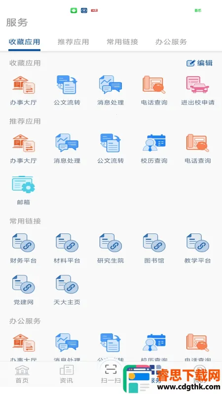 3. 设有主页、资讯、服务等功能版块,帮助高校师生更好地进行校园生活、学习和工作。
