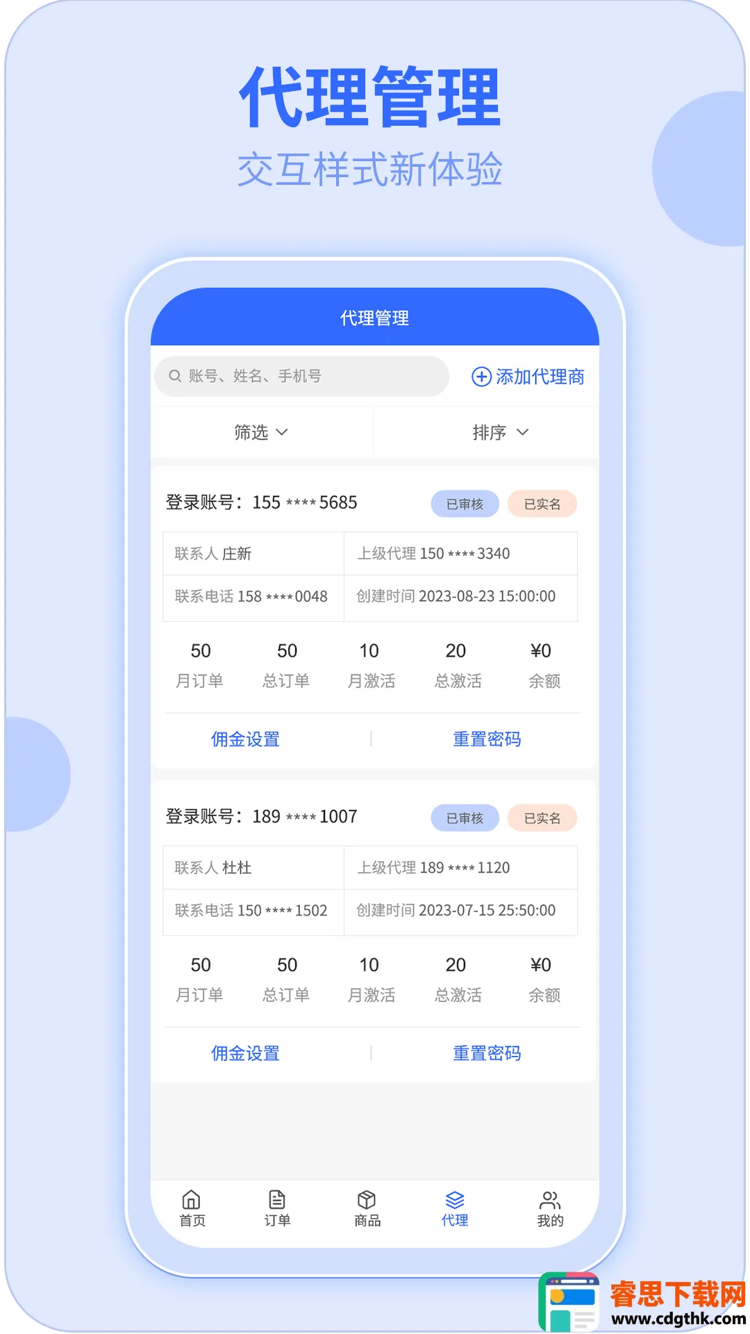 4. 代理管理灵活,可自由配置代理商佣金,添加代理商并详尽记录信息。