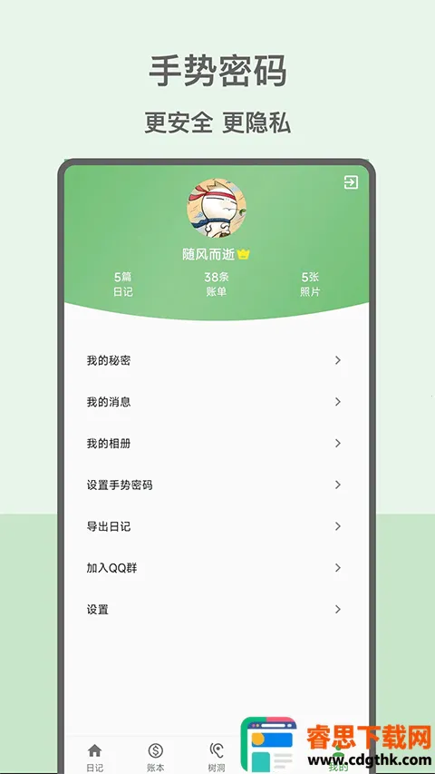 心情日记本是一款超实用的日记软件。它小巧便携,能让你在公交、咖啡店或家中随时记录情感变化。软件功能丰富,可自定义标签,根据心情打造独特记录空间;笔记清单功能一键操作,高效记录重要瞬间;多种主题任选,带来不同视觉体验;还能设置定时提醒,不错过重要日程。设置密码锁也很简单,在首页下方选“我的”,找到设置手势密码选项,点击自定义设置就行。它优势明显,界面人性化,标签丰富实用,支持多种记事形式,内存占用小。亮点众多,能畅所欲言分享情感,标签功能有趣实用,安全防护强,界面简洁操作流畅。即使忘记手势密码也别怕,按照上述设置步骤重新设置即可,它能帮你轻松记录生活点滴,保护隐私,是整理心情与记录生活的好帮手。