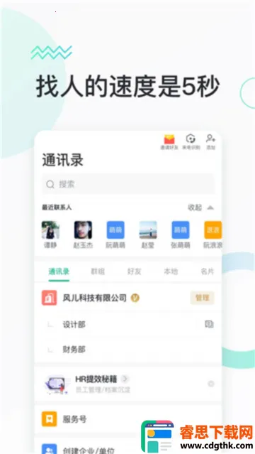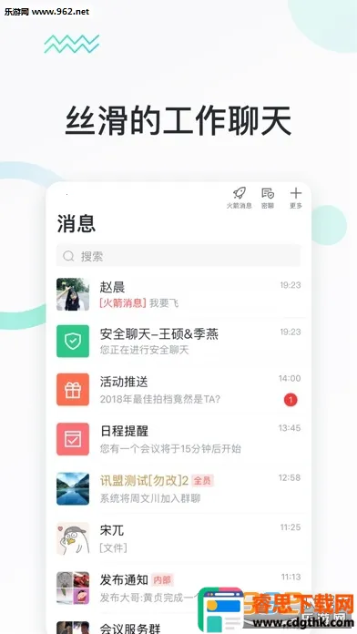 2. 沟通交流能力强大,企业通讯录5秒快速找人,火箭消息可加急通知并查看已读未读,安全聊天加密匿名、阅后即焚。