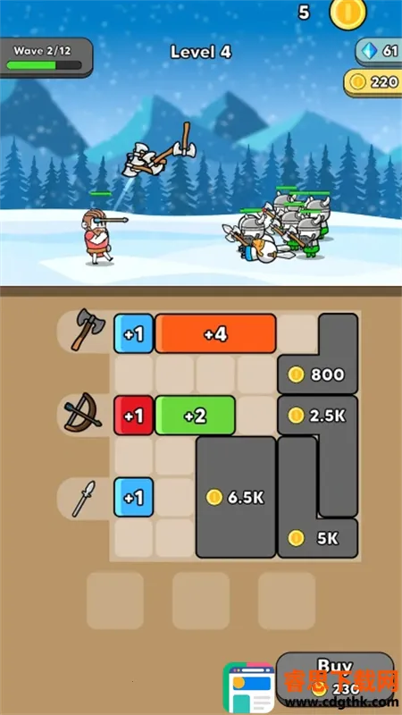 玩法上,英雄自动攻击,击败敌人得金币,用金币买方块扩展装备栏。蓝色数字道具能升级武器,相同数字可合成更大数字提升威力,记得解锁新区域。还能通过消耗资源升级村长家建筑,提升研究所等级可提高锻造等级和稀有度,锻造时有概率得符文精华换符文。